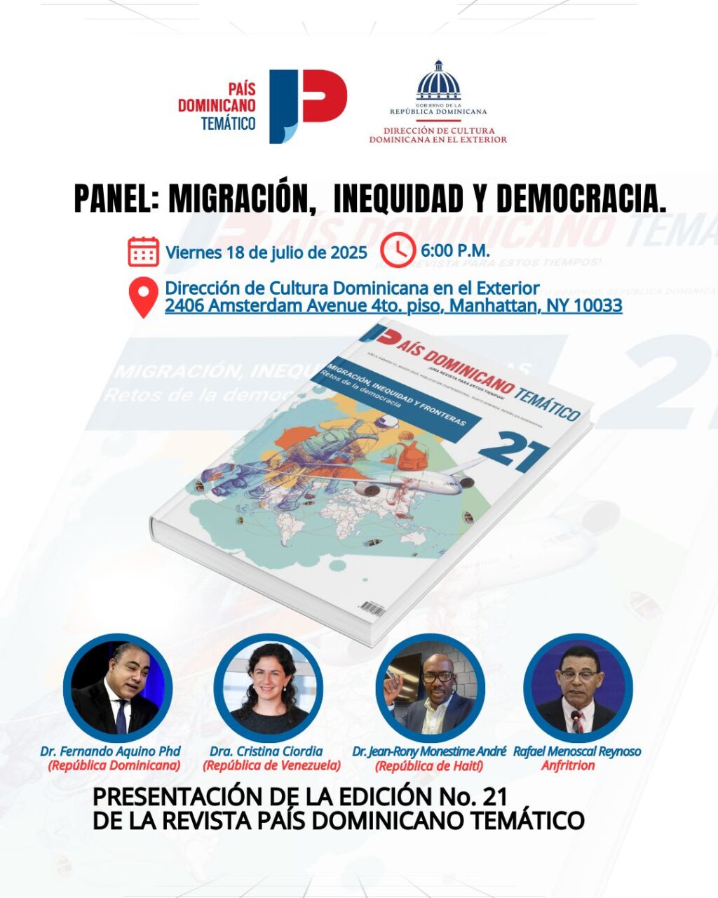 En un contexto global cada vez más marcado por desplazamientos forzados, fracturas institucionales y desigualdades crecientes, la revista País Dominicano Temático, presentará en Nueva York su edición número 21 con un panel internacional que propone pensar críticamente el presente de nuestras sociedades: “Migración, Inequidad y Democracia”. El acto se celebrará este viernes 18 a las 6:00 de la tarde en la Dirección de Cultura Dominicana en el Exterior, ubicada en el 2406 de Amsterdam Avenue, 4to piso, en Manhattan.