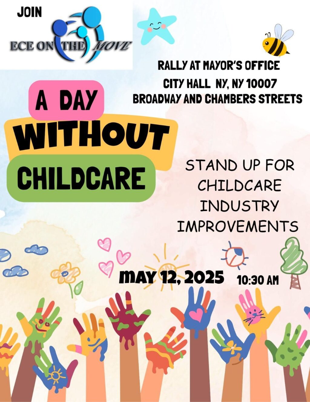 La organización ECE on the Move invita a todas las proveedoras, padres y empleadas del cuidado infantil de la ciudad de New York a participar de la protesta que se llevará a cabo frente a la oficina del alcalde en el City Hall, este lunes 12 de Mayo a las 10:30 AM., para exigirle al funcionario no dejar fuera del presupuesto a miles de familias de bajos ingresos.
